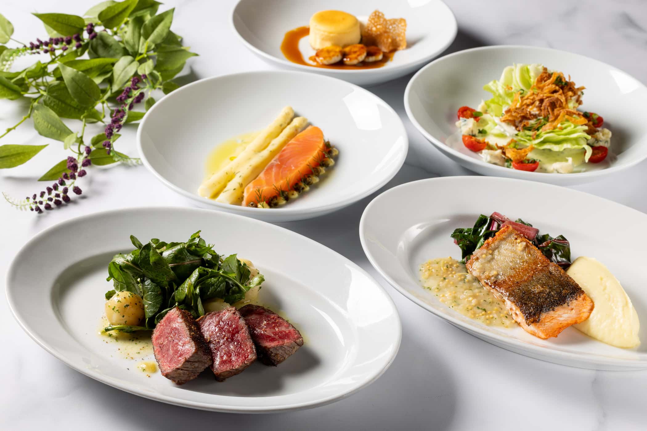 Enjoy a weekdays only lunch course with your choice of appetizer and main dish. Featuring seasonal appetizers and a selection of mains such as Salisbury steak and grilled Fujisan salmon, this course invites you to savor a leisurely lunchtime experience.