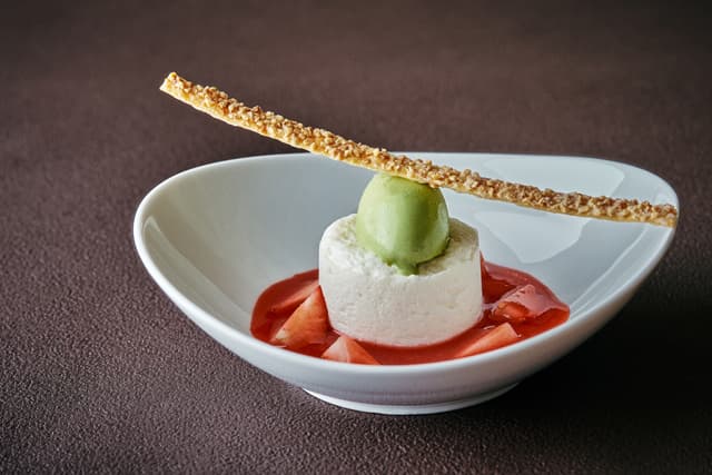 最後にはなめらかなリコッタチーズムースと香ばしいピスタチオアイスクリーム、甘酸っぱいストロベリースープがハーモニーを織りなすデザートでディナーを締めくくります。