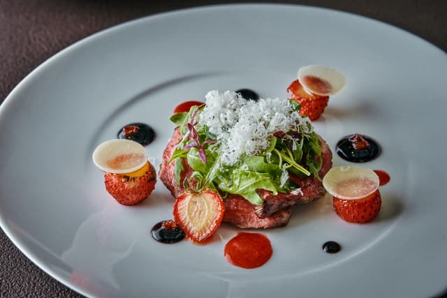 国産牛サーロインのタリアータ パルミジャーノレッジャーノ いちごのキャラメリゼ