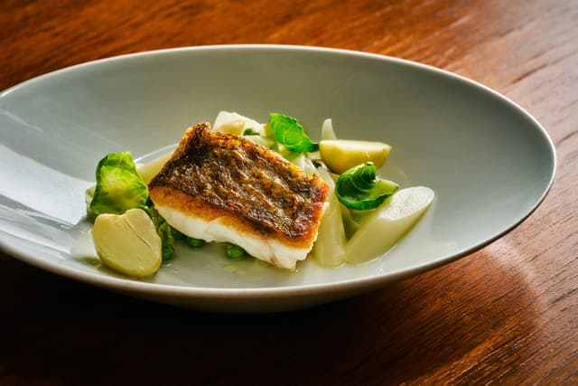 白身魚 えび いか ムール貝 クリームスープ - 鰆のポワレ ハーブバターソース