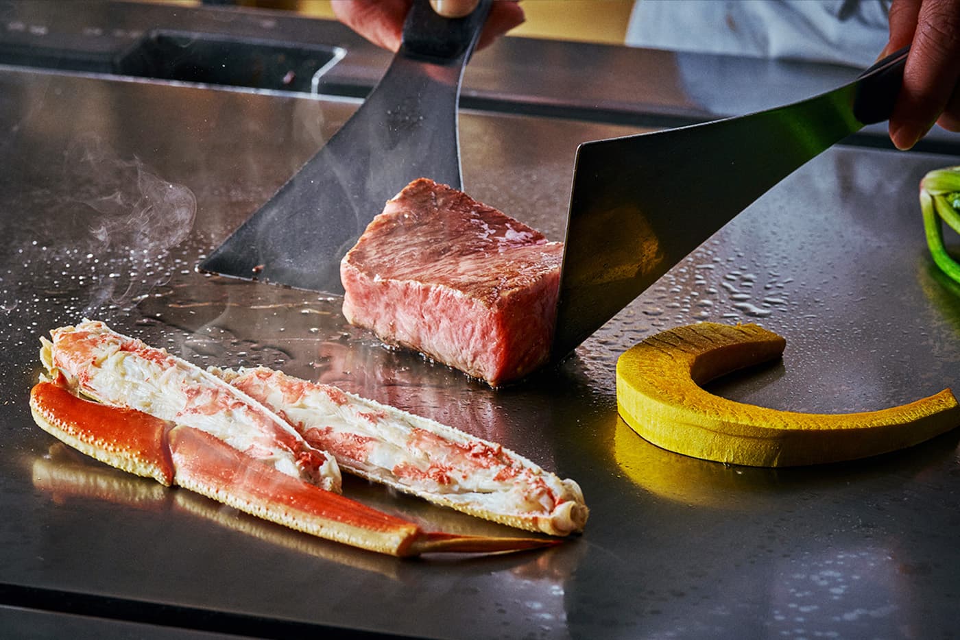 六本木のホテル、グランド ハイアット 東京の鉄板焼「けやき坂」では、冬に旬を迎える松葉ガニをつかったメニューとホテルオリジナルのけやき坂ビーフの食べ比べをメインディッシュに味わう冬季限定のディナーコースを提供いたします。シャンパンもお選びいただけるウエルカムドリンクがついたオンライン予約限定プランもご用意しております。